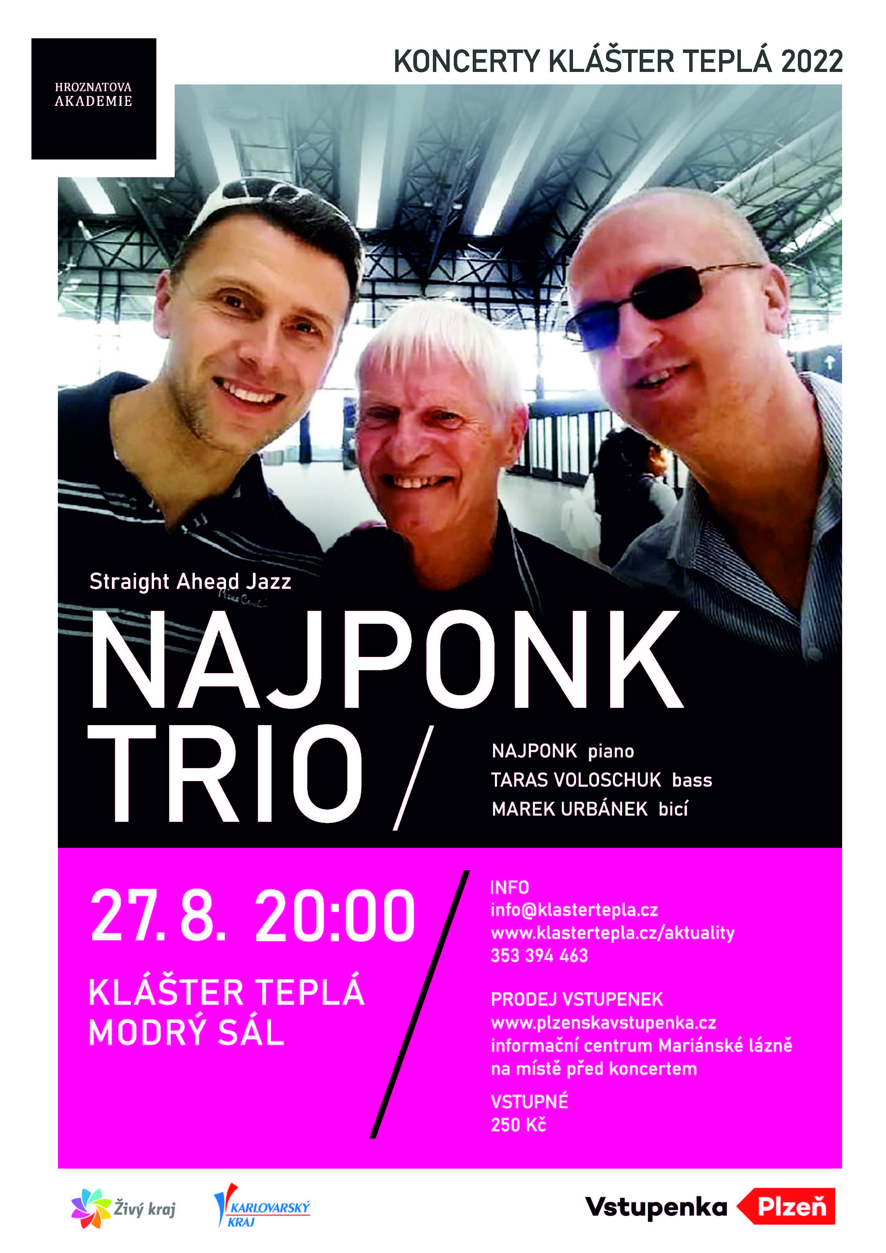 v sobotu 27. srpna 2022 se od 20.00 v Modrém sále kláštera uskuteční jazzový koncert skupiny NAJPONK TRIO ve složení Najponk – piano, Taras Voloschuk – bass a Marek Urbánek – bicí.