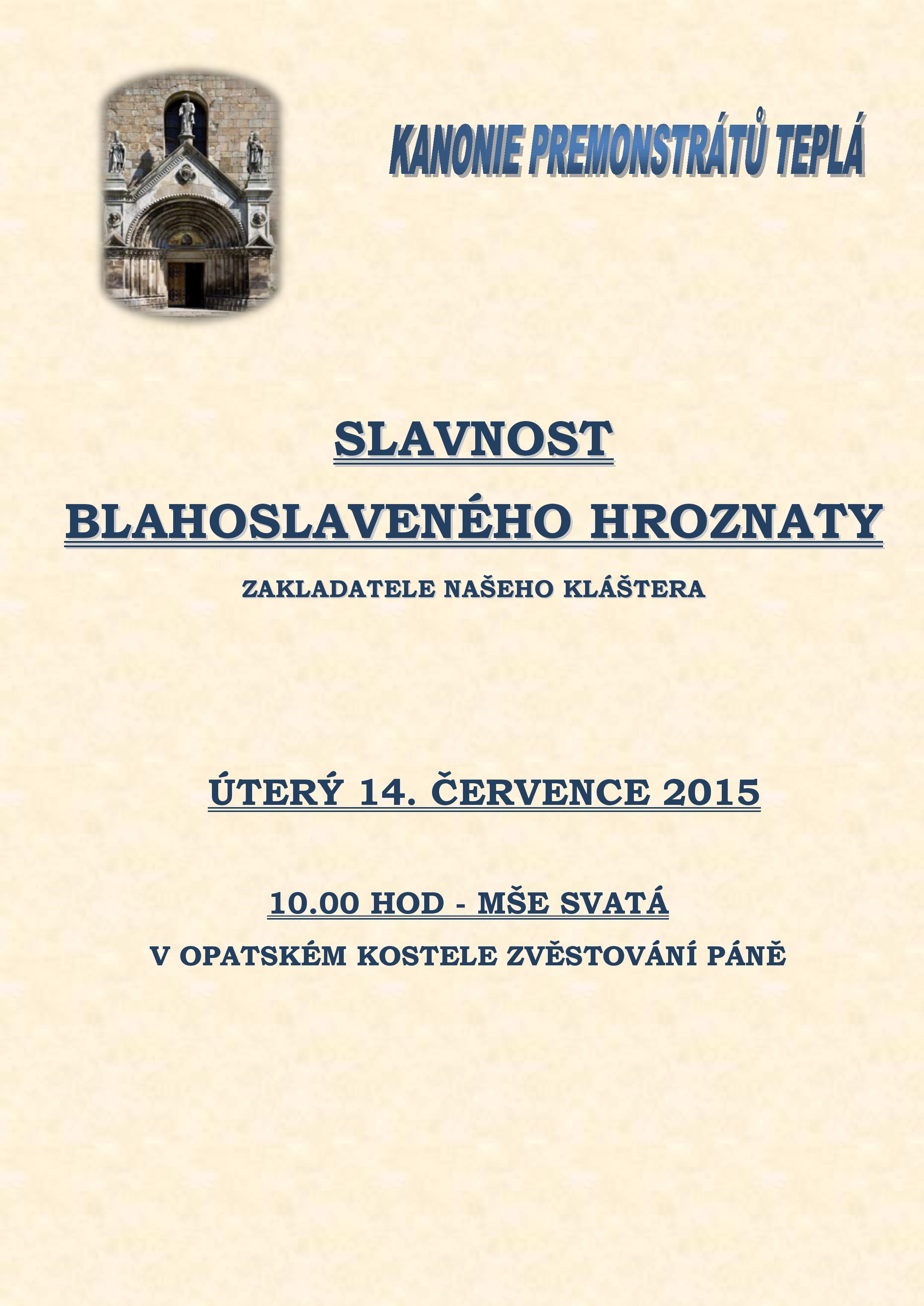 Slavnost bl. Hroznaty zakladatele našeho kláštera proběhne na jeho svátek 14. července. Slavnostní mše v klášterním kostele Zvěstování páně začne v 10. hodin. V následující sobotu, 18. července proběhne pouť k bl. Hroznatovi. Program začne slavnostní mší v 10. hodin. Od 13. do 14. hodin Vás zveme na volnou prohlídku kostela, klášterní knihovny a nově rekonstruovaného křídla prelatury a konventu. Naši průvodci rádi odpoví na Vaše dotazy. Večer se můžete těšit na koncert plzeňské varhanice Jitky Chaloupkové, který začne v 16. hodin. Další informace a rezervace vstupenek na telefonu 353 392 732 nebo mejlem Tato e-mailová adresa je chráněna před spamboty. Pro její zobrazení musíte mít povolen Javascript.